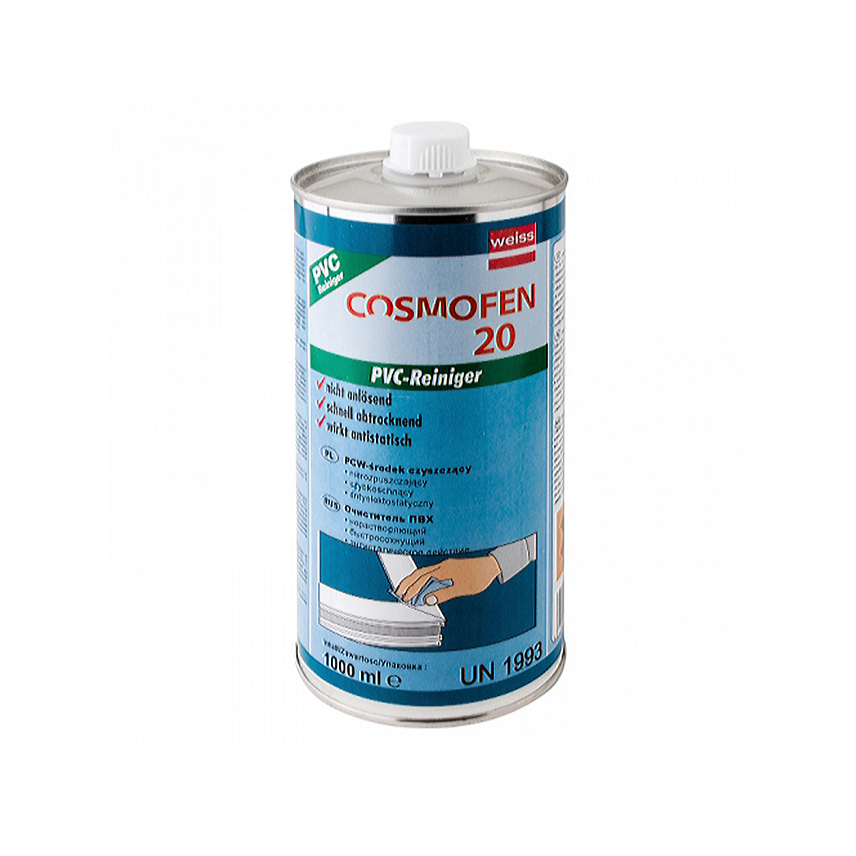Очиститель COSMOFEN 20 нерастворяющий с антистатиком применяется для профессиональной чистки профилей из жесткого ПВХ, Платы из вспененного твёрдого ПВХ напр. Forex®, полиуретана и профилей, кашированных ренолитной пленкой.